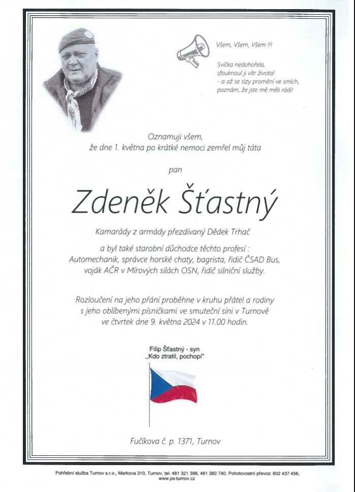 opustil nás náš veterán, přítel a kamarád Zdenda Šťastný – DĚDEK TRHAČ. Zdenda byl od dubna 1993 do dubna 1994 v mírové misi UNPROFOR, kde působil v četě technického zabezpečení Českého praporu. Pokud si ho budeme chtít připomenout, tak je o něm mnoho stránek a rovněž i fotografií v knize Vzpomínky na válku v mírové misi UNPROFOR na území bývalé Jugoslávie, do které zapůjčil fotky ze čtyř alb a novinové články z doby působení v této misi.