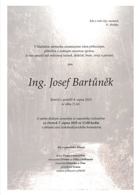 Poslední rozloučení se proběhne ve čtvrtek 7.srpna 2025 ve 12:00 hod. v krematoriu v Českých Budějovicích.