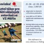 Ing. Patrik Letocha, náměstek ředitele VLRZ, informoval o plánu uspořádat prázdninové tábory pro děti válečných veteránů a zaslal nám podklady k dětským táborům. Tábory jsou určeny nejen pro děti válečných veteránů, ale také pro vnuky a případě i pravnuky válečných veteránů. Takže v případě některých z nás může být na táboře syn i několik vnuků. Nabídku táborů pro děti veteránů připravily také Vojenské lesy a statky.