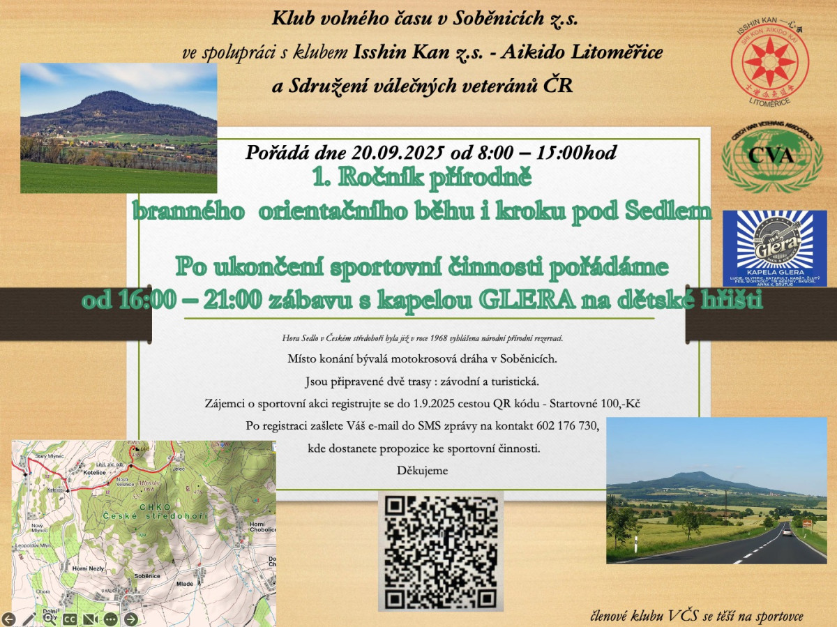 Klub volného času v Soběnicích z.s. ve spolupráci s klubem Isshin Kan z.s. – Aikido Litoměřice a Sdružením válečných veteránů ČR vás srdečně zve na 1. ročník přírodně branného orientačního běhu i kroku, který se uskuteční v sobotu 20. září 2025.